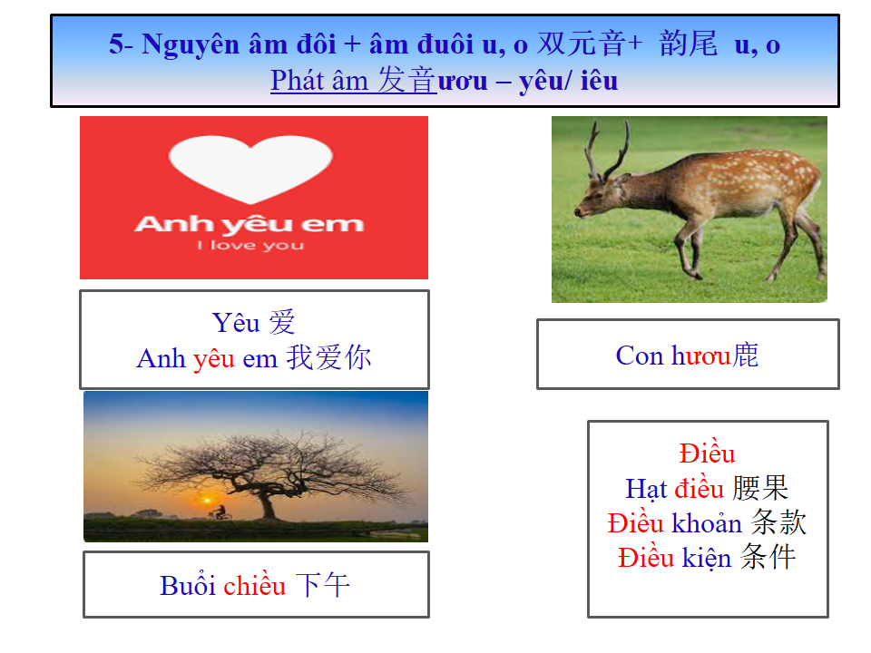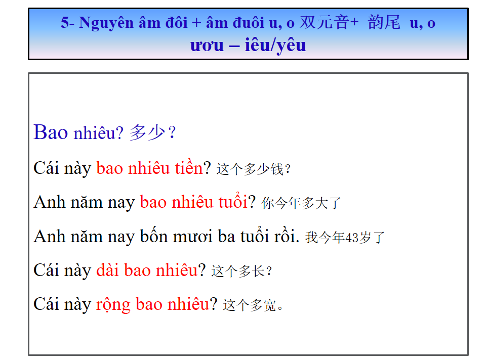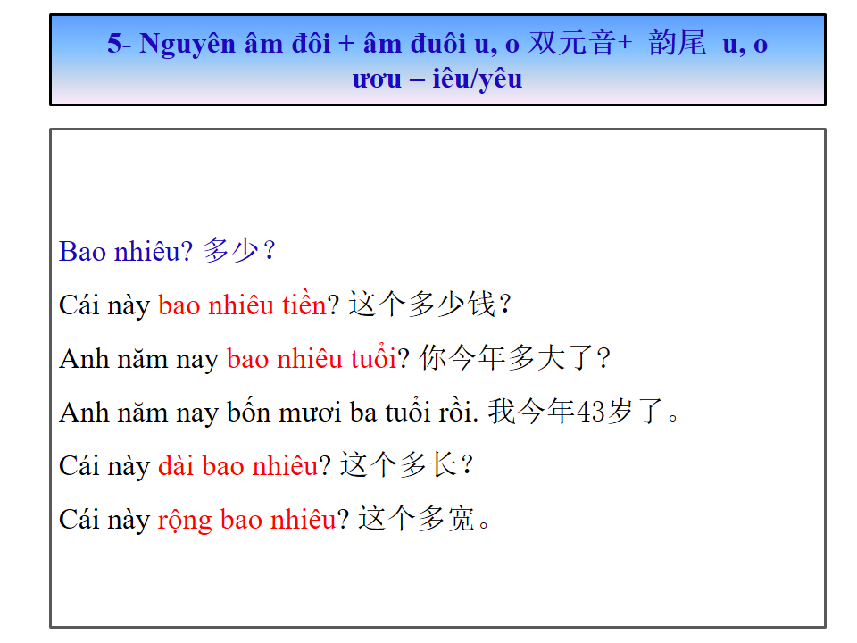 双元音+ 韵尾 u, o Nguyên âm đôi + âm đuôi u, o giáo trình Tiếng Việt sơ cấp 1 第九课 Bài số 9 : 元音+韵尾 u, o Nguyên âm + đuôi u,o 双元音+ 韵尾 u, o Nguyên âm đôi + âm đuôi u, o Please enable JavaScriptplay-sharp-fill Previous Topic Back to Lesson Next Topic