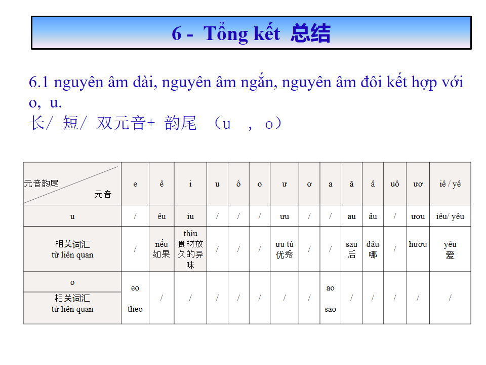 giáo trình Tiếng Việt sơ cấp 1 第九课 Bài số 9 : 元音+韵尾 u, o Nguyên âm + đuôi u,o 总结 Tổng kết