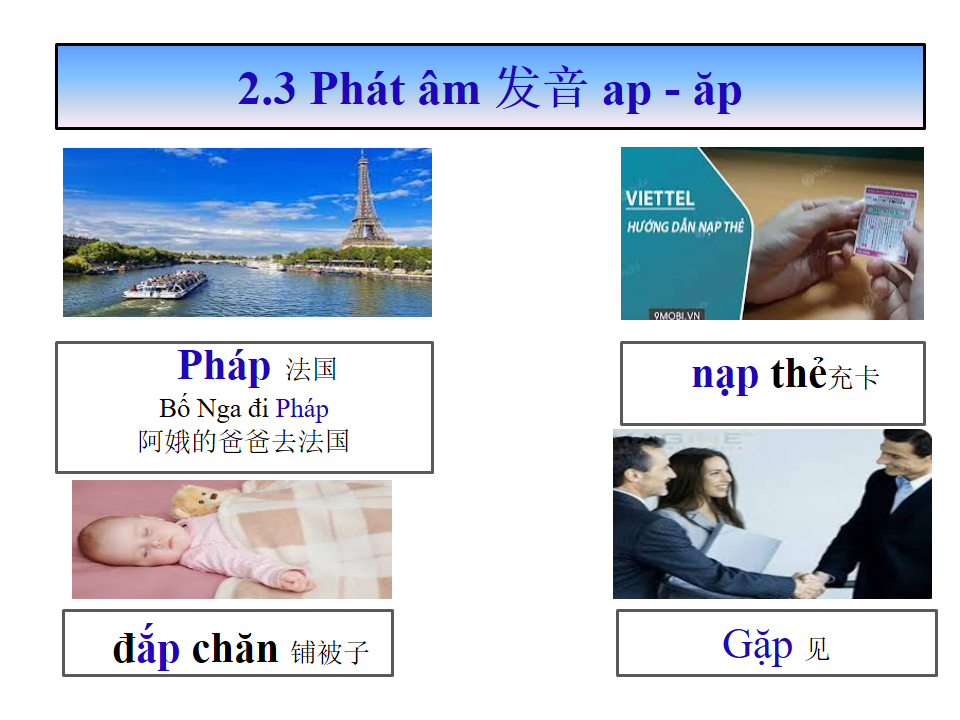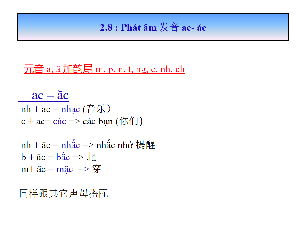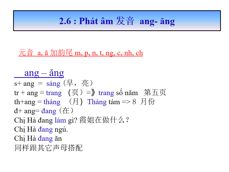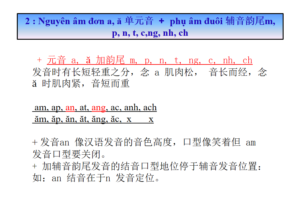 单元音 nguyên âm đơn a, ă + 辅音韵尾 phụ âm đuôi m, p, n, t, c,ng, nh, ch giáo trình Tiếng Việt sơ cấp 1 第五课 Bài số 5: 元音+ 辅音韵尾 Nguyên âm + phụ âm đuôi m, n, t, c p, nh, ng, ch 单元音 nguyên âm đơn a, ă + 辅音韵尾 phụ âm đuôi m, p, n, t, c,ng, nh, ch Please enable JavaScriptplay-sharp-fill Previous Topic Back to Lesson Next Topic