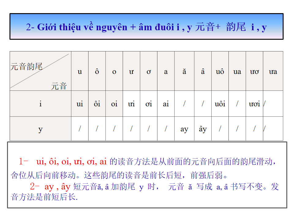 元音+ 韵尾 i , y giới thiệu về nguyên + âm đuôi i , y giáo trình Tiếng Việt sơ cấp 1 第八课 Bài số 8 : 元音+ 韵尾 i , y Nguyên âm+ nguyên âm đuôi i , y 元音+ 韵尾 i , y giới thiệu về nguyên + âm đuôi i , y Please enable JavaScriptplay-sharp-fill Previous Topic Back to Lesson Next Topic