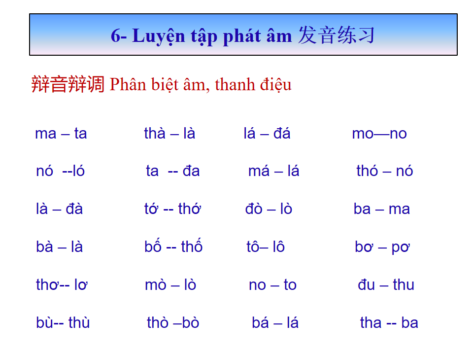 发音练习 Luyện tập phát âm giáo trình Tiếng Việt sơ cấp 1 第一课 单元音, 辅音 及声调 Nguyên âm đơn, phụ âm, thanh điệu (phần 1) 发音练习 Luyện tập phát âm Please enable JavaScriptplay-sharp-fill Previous Topic Back to Lesson Next Topic