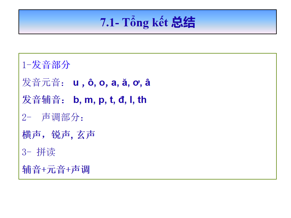 giáo trình Tiếng Việt sơ cấp 1 第一课 单元音, 辅音 及声调 Nguyên âm đơn, phụ âm, thanh điệu (phần 1) 总结及作业 Tổng kết và bài tập