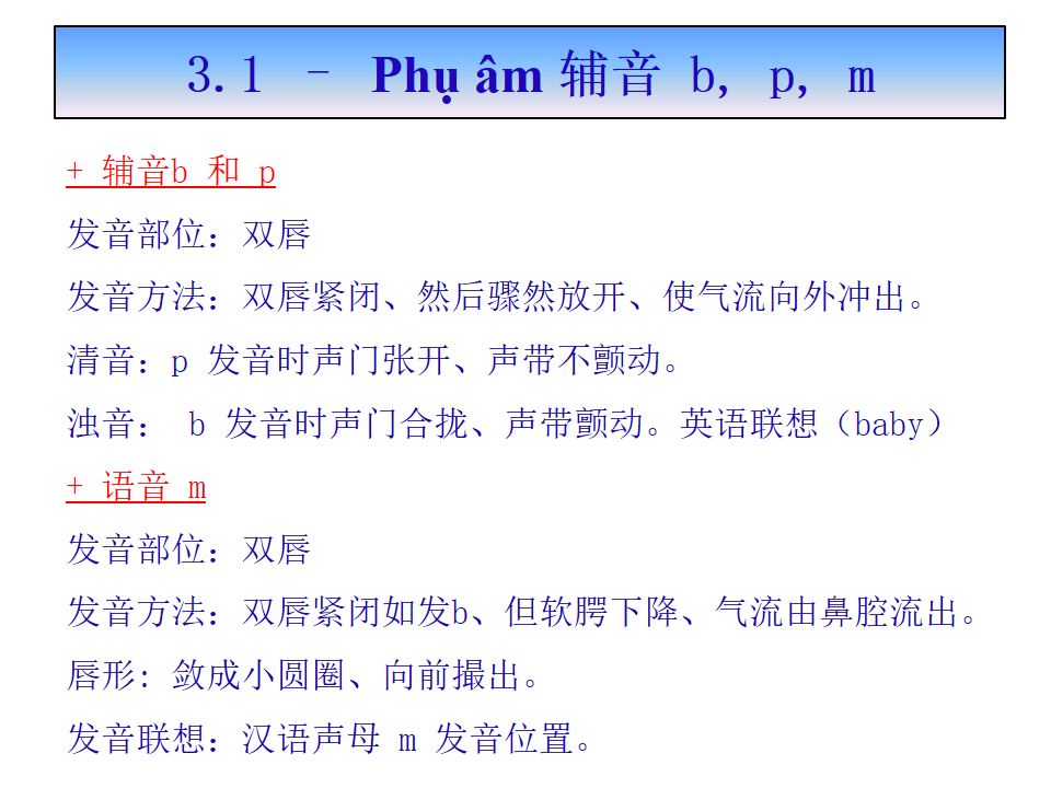 辅音发音Phát âm phụ âm:b, m, n, p, t, đ, l, th giáo trình Tiếng Việt sơ cấp 1 第一课 单元音, 辅音 及声调 Nguyên âm đơn, phụ âm, thanh điệu (phần 1) 辅音发音Phát âm phụ âm:b, m, n, p, t, đ, l, th Please enable JavaScriptplay-sharp-fill Previous Topic Back to Lesson Next Topic