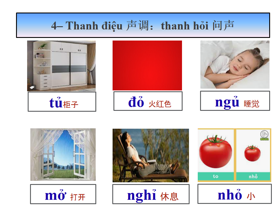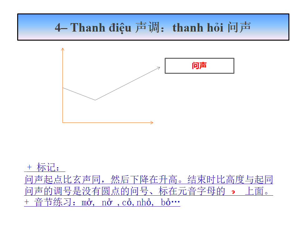 giáo trình Tiếng Việt sơ cấp 1 第二课 单元音, 辅音 及声调 Nguyên âm đơn, phụ âm, thanh điệu (phần 2) 声调Thanh điệu:问声thanh hỏi