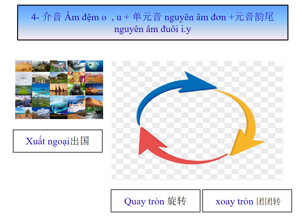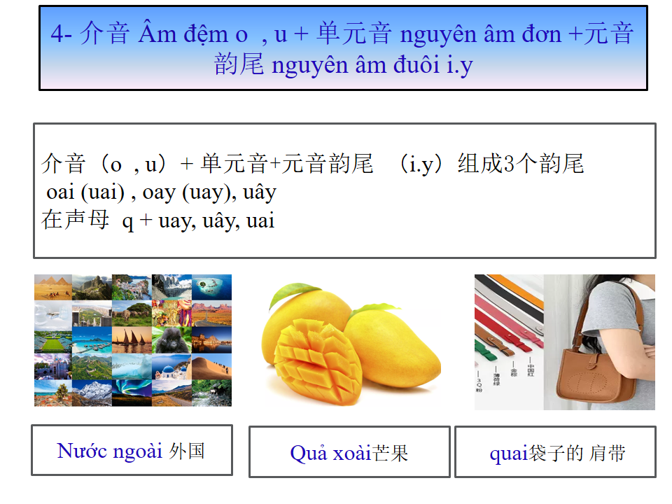 介音 âm đệm o , u + 单元音 nguyên âm đơn +元音韵尾 nguyên âm đuôi i.y