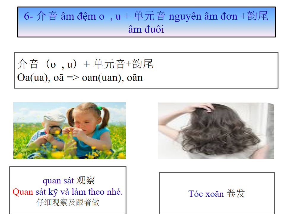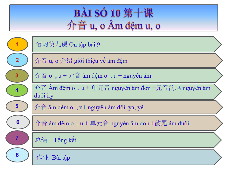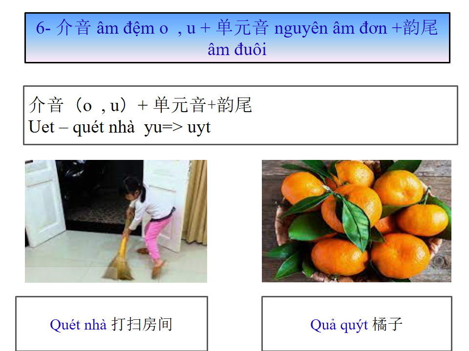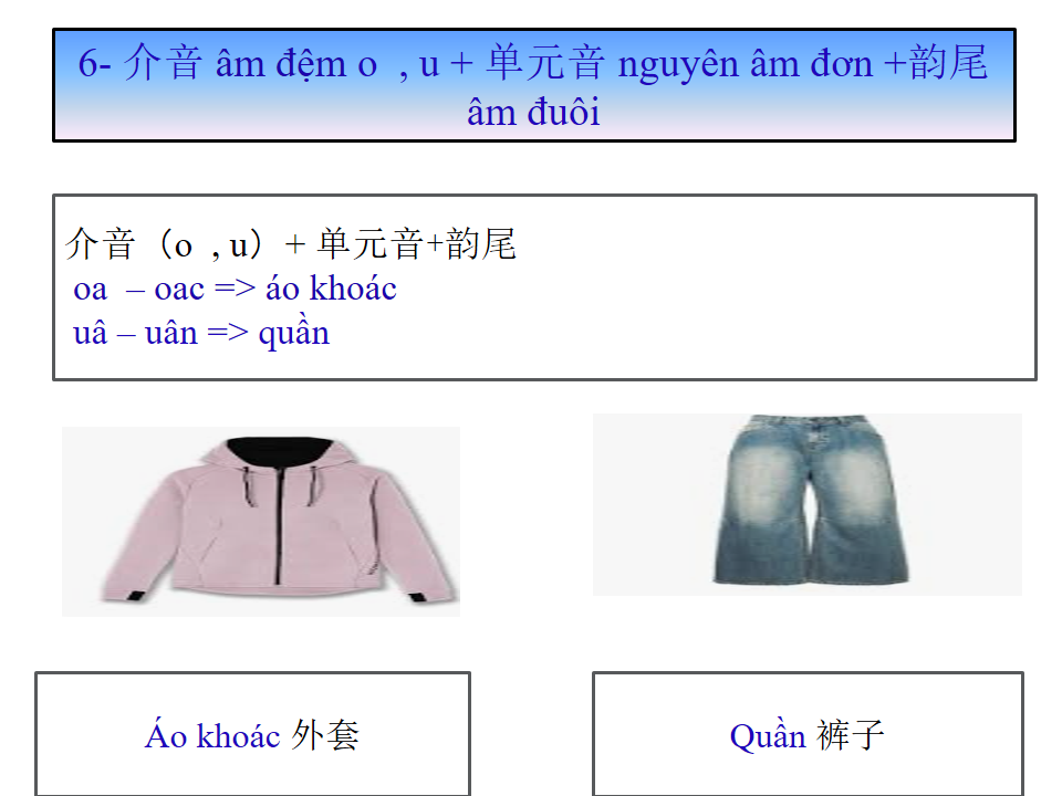 介音 âm đệm o , u + 单元音 nguyên âm đơn +韵尾 âm đuôi giáo trình Tiếng Việt sơ cấp 1 第 十课 Bài số 10 : 介音 u, o Âm đệm u, o 介音 âm đệm o , u + 单元音 nguyên âm đơn +韵尾 âm đuôi Please enable JavaScriptplay-sharp-fill Previous Topic Back to Lesson Next Topic