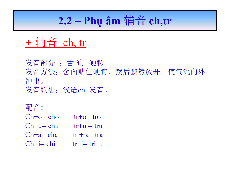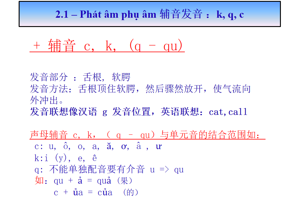 辅音发音Phát âm phụ âm :k, q, c, ch, tr, d, gi, r